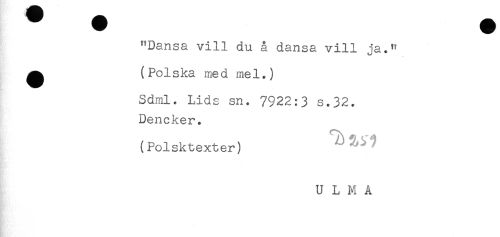 //// å ) //// "Dansa vill du å dansa vill ja." //// ^ (Polska med mel.) //// Sdml. Lids sn. 7922:3 s.32. //// Dencker. //// (Polsktexter) //// U L M A //// - ////