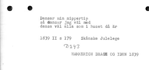 //// Dansar min nippertip //// så dansar jag väl med //// dansa väl alla som i huset då är //// 1339 II s 179 Skånske Julelege //// HAMMERICH BRAGE OG IDUN 1339 ////