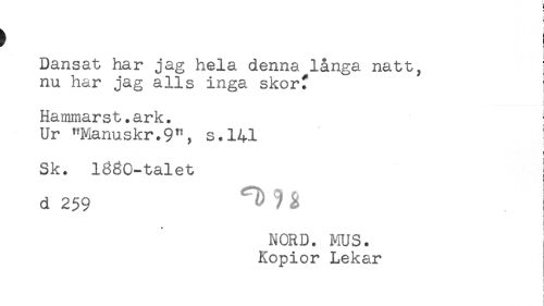//// Dansat har jag hela denna långa natt, i //// nu har jag alls inga skorf //// t //// Hammarst.ark. //// Ur "Manuskr.9", s.141 //// i //// Sk. 18g0-talet //// d 259 //// NORD. MUS. //// Kopior Lekar ////