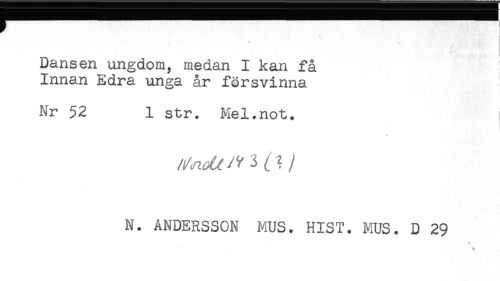 //// Dansen ungdom, medan I kan få //// Innan Edra unga år försvinna //// Nr 52 1 str. Mel.not. //// N. ANDERSSON MUS. HIST. MUS. D 29 ////