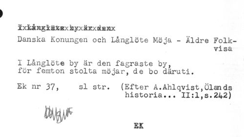 //// Danska Konungen och Långlöte Möja - Äldre Folk- //// visa //// 1 Långlöte by är den fagraste by, //// för femton stolta möjar, de bo däruti. //// Ek nr 37, si str. (Efter A.Åhlqvist,Ölands //// historia... 11:1,s.242) //// EK ////