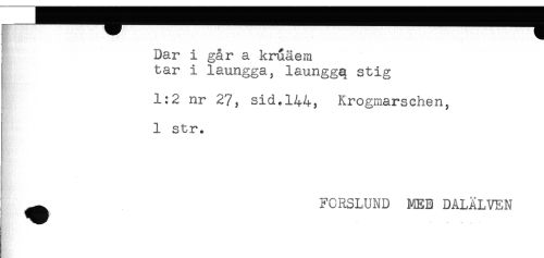 //// .... -... //// Dar i går a kruäem //// tar i laungga, launggq stig //// 1:2 nr 27, sid.144, Krogmarschen, //// * //// 1 str. //// ^ FORSLUND MED DALÄLVEN ////