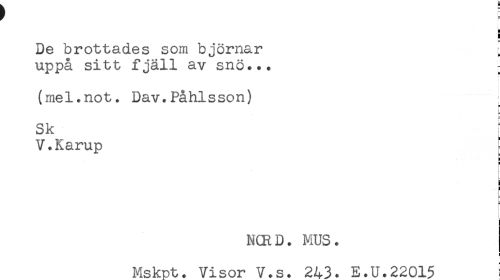 //// g //// ] //// De brottades som björnar //// uppå sitt fjäll av snö... = //// (mel.not. Dav.Påhlsson) . //// r //// F //// Sk : //// V.Karup ^ //// [ //// f //// i //// N(RD. MUS. //// Mskpt. Visor V.s. 243. E.U.22015 ////