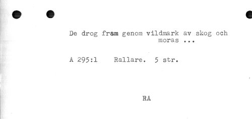 //// De drog fram genom vildmark av skog och //// moras ... //// A 295:1 Rallare. 5 str. //// * //// RÅ ////