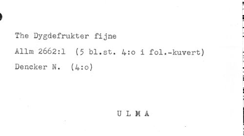 //// t ! //// ! //// H //// The Dygdefrukter fijne - //// Allm 2662:1 (5 bl.st. 4:o i fol.-kuvert) r //// Dencker N. (4:o) //// E //// ! //// H //// U L M Å //// g //// i //// e ////