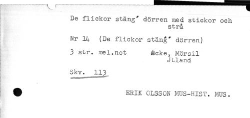 //// De flickor stäng" dörren med stickor och //// strå //// Nr (De flickor stäng' dörren) //// 3 str. mel.not åcke, Mörsil //// Jtland //// Skv._113 //// # ERIK OLSSON MUS-HIST. MUS. //// K;'' : ////