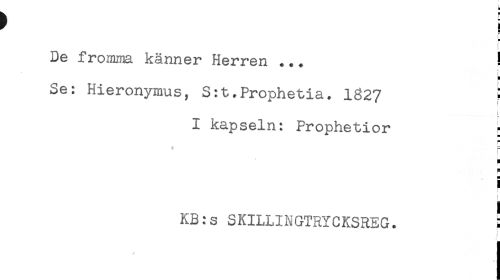 //// ^ a //// t //// : //// i //// De fromma känner Herren ... ! //// t //// Se: Hieronymus, S:t.Prophetia. 1327 ^ //// I kapseln: Prophetior r //// F //// = //// B //// ' ? //// t //// KB:s SKILLINGTRYCKSREG. ^ ////