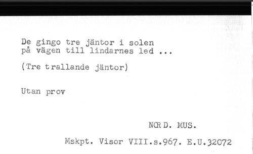 //// ) //// De gingo tre jäntor i solen //// på vägen till lindarnes led ... //// < //// (Tre trallande jäntor) //// Utan prov //// i //// NCRD. MUS. //// Mskpt. Visor VIII.s.967. E.U.32072 //// : ////