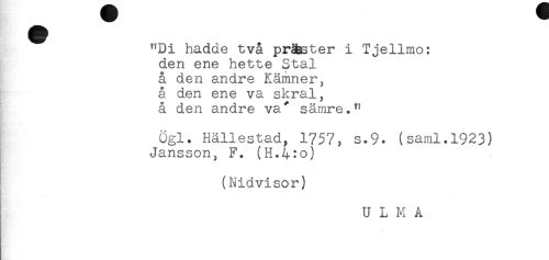 //// "Di hadde två pr&ster i Tjellmo: //// den ene hette Stal //// å den andre Kämner, //// å den ene va skral, //// å den andre va" sämre." //// Ogl. Hällestad, 1757, s.9. (saml.1923) //// Jansson, F. (H.4:o) //// (Nidvisor) //// ULMA ////
