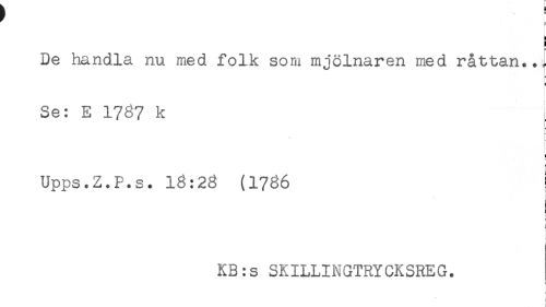 //// ! //// ! //// De handla nu med folk som mjölnaren med råttan... //// * //// 5 //// Se: E 1787 k //// ! //// < //// Upps.Z.F.s. 16:26 (1786 ! //// ^ //// r //// t //// KB:s SKILLINGTRYCKSREG. //// ! //// i //// i ////