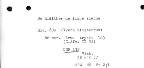 //// De hUlther de ligge slagne //// Sid. 689 (Vreta klosterrov) //// 66 str. Arw. tryckt 163 //// (G.Afz. II 92) //// DGF 138 //// ——"' Visb. //// KB 4:0 57 //// ARW MS Vs 2;1 ////