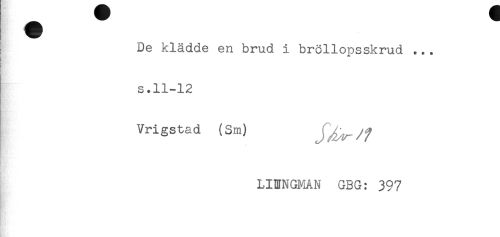 //// De klädde en brud i bröllopsskrud ... //// s.11-12 //// Vrigstad (Sm) J^/f //// LINNGMAN GBG: 397 ////