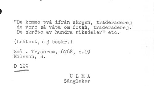 //// "De kommo två ifrån skogen, traderaderej ! //// de voro så våta om fot^Q, traderaderej. //// De skröto av hundra riksdaler" etc. //// (Lektext, e j beskr.) //// Småi. Tryserum, 6763, s.19 //// Nilsson, 3. //// D 129 //// U L M A //// Sånglekar ////