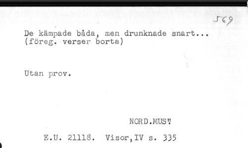 //// De kämpade båda, men drunknade snart... //// (föreg. verser borta) //// Utan prov. //// NORD.MUST //// E.U. 21118. Visor,IV s. 335 //// t ////