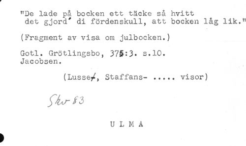 //// "ue JLa,a.e pa uocKen euu uacxe sa fivj-uu //// det gjord^ di fördenskull, att bocken låg lik." //// (Fragment av visa om julbocken.) //// Gotl. Grötlingsbo, 375:3* s.10. //// Jacobsen. //// A ^ //// (Lusse/, Staffans- ..... visor) //// U L M Å //// t ////