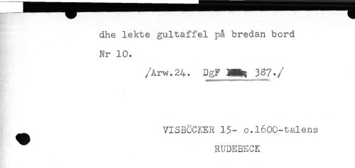 //// dhe lekte gultaffel på bredan bord //// Nr 10. //// /Arw.24. DgF 3HH 3^7. //// /VISBÖCKER 15- o.l600-talens //// RUDEBECK ////