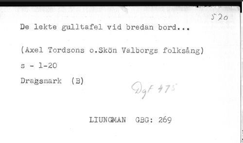 //// De lekte gulltafel vid bredan bord... //// (Åxel Tordsons o.Skön Valborgs folksång) //// s - 1-20 //// Dragsmark (3) //// i //// < //// LIUNGMAN G3G: 269 //// L //// f //// - //// : ////