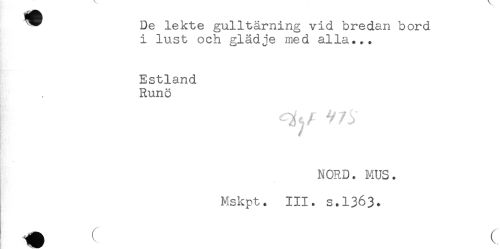 //// ^ De lekte gulltarnmg vid bredan bord //// i lust och glädje med alla... //// Estland //// Runö //// I //// ! //// NORD. MUS. //// Mskpt. III. s.1363. ////