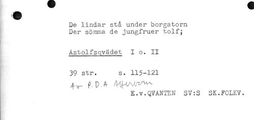 //// De lindar stå under borgatorn //// Der sömma de jungfruer tolf; //// ! //// Åstolfsqvädet I o. II //// 39 str. s. 115-121 //// E.v.QVANTEN SV:S SK.FOLKV. ////