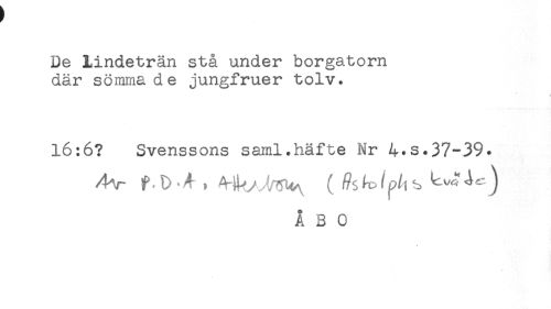 //// De jLindeträn stå under borgatorn //// där sömmade jungfruer tolv. //// <i //// 16:6? Svenssons saml.häfte Nr 4.s.37-39. //// ÅBO //// //// /