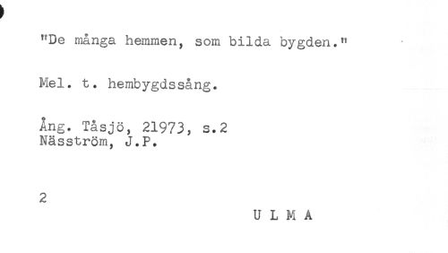 //// "De många hemmen, som bilda bygden." //// Mel. t. hembygdssång. //// Ang. Tåsjö, 21973, s.2 //// Näsström, J.P. //// 2 //// ULMA ////