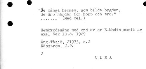 //// "De många hemmen, som bilda bygden, //// de äro härdar för hopp och tro." //// ....... ' (Med mel.) //// Hembygdssång med ord av dr E.Modin,musik av //// Axel Eek 10.3. 1929 //// Ång.Tåsjö, 21973, s.2 //// Näsström, J.P. //// 2 //// ULMA ////
