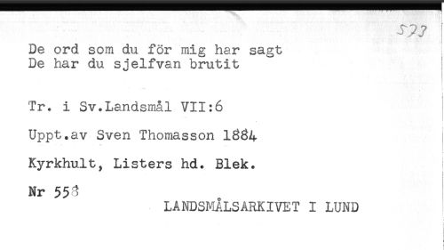 //// De ord som du för mig har sagt //// De har du sjelfvan brutit //// Tr. i Sv.Landsmål VII:6 //// Uppt.av Sven Thomasson //// - * * * ^ //// Kyrkhult, Listers hd. Blek. //// ! //// ! //// Nr 553 //// LANDSMÅLSARKIVET I LUND //// t ////