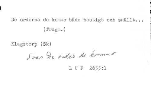 //// De orderna de kommo både hastigt och snällt... [ //// i= //// (fragm.) i //// i //// : //// Klagstorp (Sk) //// L U F 2655:1 ////