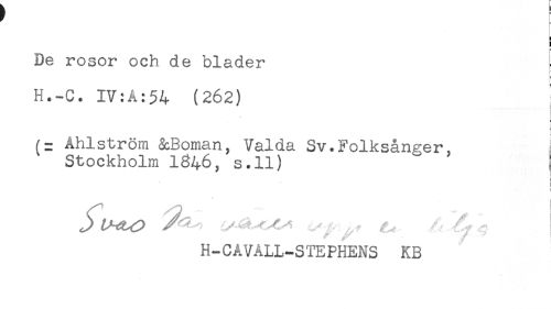 //// - //// t //// ! //// De rosor och de blader //// H.-C. IV:A:54 (262) ' //// L //// * //// (= Ahlström &Boman, Valda Sv.Folksånger, //// Stockholm 1346, s.ll) ] //// ! //// ] //// -- /"' ' / ! //// H-CÅVÄLL-STEPHENS KB ////