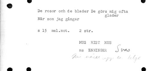 //// De rosor och de blader De görs mig ofta //// gläder //// När som jag gångar //// s 15 mel.not. 2 str. //// MUS HIST MUS //// ms ENNINGER <J //// ^ H' H H HK ////