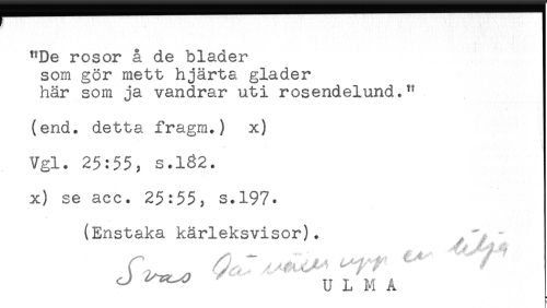 //// "De rosor å de blader //// som gör mett hjärta gläder //// här som ja vandrar uti rosendelund." //// (end. detta fragm.) x) //// Vgl. 25:55, s.182. //// x) se acc. 25:55, s.197* //// (Enstaka kärleksvisor). "*. - //// ^ ^^ U L M Å ////