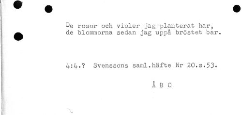 //// ! De rosor och violer jag planterat har, //// ^^ de blommorna sedan jag uppå bröstet bar. //// } //// 4:4*? Svenssons saml.häfte Nr 20.S.53* //// ÅBO //// t //// § ////