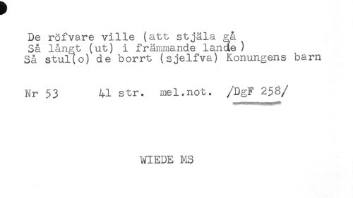 //// De röfvare ville (att stjäla gå //// Så långt (ut) i främmande lande) //// Så stul(o) de borrt (sjelfva) Konungens barn //// Nr 53 41 str. mel.not. /DgF 25S //// /WIEDE MS ////