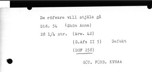 //// De röfvare vill stjäla gå //// Sid. 54 ^Skön Anna) //// 28 1/4 str. (Arv.'. 42) //// (G.Afz II 5) Defekt //// (DGF 258) //// # GÖT. FÖRB. KVHAA ////