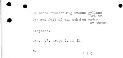 //// ! //// De satte framför mig tvenne gyllene //// skålar. //// A Den ena full af vin och d en andra //// i ^^ av tårar. //// i //// j Ringdans. //// 2:4. VÅ. Brage 2. nr 31. //// N. //// A B 0 ////