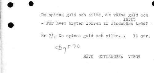//// ! //// De spinna guld och silke, de väfva guld och //// lärft //// I ^ - För hvem bryter löfven af lindebärs träd? - //// Nr 75; De spinna guld och silke... 10 str. //// SAVE GOTLÄNDSKA 7IS0R //// ) //// j ////