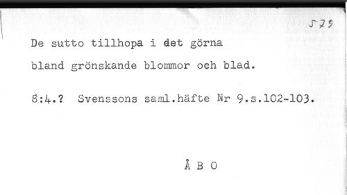 //// I J^? //// De sutto tillhopa i det göma //// bland grönskande blommor och blad. //// Svenssons saml.häfte Nr 9.s.102-103. //// 'i //// 1 //// i //// I //// < //// t //// ! ////