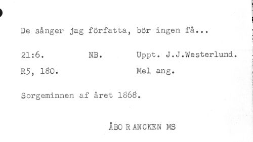 //// ! //// De sånger jag författa, bör ingen få... ; //// 21:6. NB. Uppt. J.J.Westerlund. //// E //// R5, 130. Mel ang. //// i //// ! //// Sorgeminnen af året 1868. //// ÅBO RANCKEN MS ////