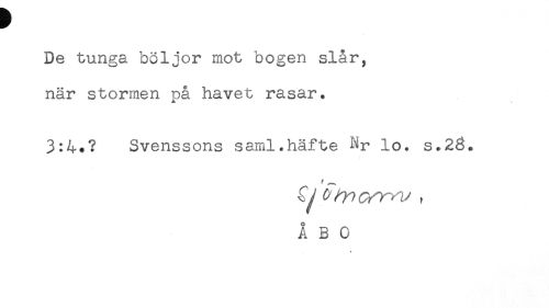 //// De tunga böljor mot bogen slår, //// när stormen på havet rasar. //// 3:4.? Svenssons saml.häfte ^r lo. s.26. //// ÅBO ////