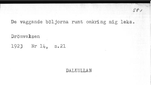 //// rf //// /De vaggande böljorna runt omkring mig leka. //// i //// Drömvaksen //// v : //// 1923 Nr 14, s.21 //// * //// DALKULLAN ////