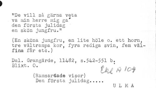 //// "De vill så gärna veta //// va min herre mig ga* //// den första julidag //// en skön jungfru." //// (En sköna jungfru, en lite höle o. ett horn, //// tre vältrampa kor, fyra rediga svin, fem väl- //// fina får etc.) //// Dal. Grangärde, 11482, s.542-551 b. //// Blixt. 0. //// (RamsarRade visor) //// Den första julidag..... //// U L M Å ////
