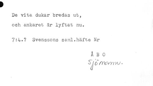 //// De vita dukar bredas ut, //// och ankaret är lyftat nu. //// 7:4*? Svenssons saml.häfte Nr //// ÅBO //// ^ /t/ - //// ! ////