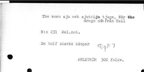 //// The voro sju och sjuttigs tjuge, När Rhe //// j drogo uth från Hall //// ) N:o 231 Mel.not. //// De tolf starke kämpar //// I ^ ÅHLSTRÖM 300 folkv. ////