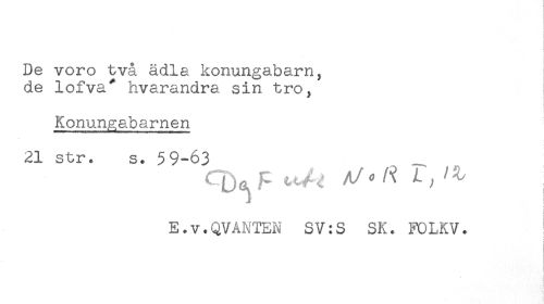 //// De voro två ädla konungabarn, //// de lofva* hvarandra sin tro, //// r //// Konungabarnen //// 21 str. s. 59-63 //// t //// < //// i //// E.v.QVAKTEN SV:S SK. FOLKV. //// t ////