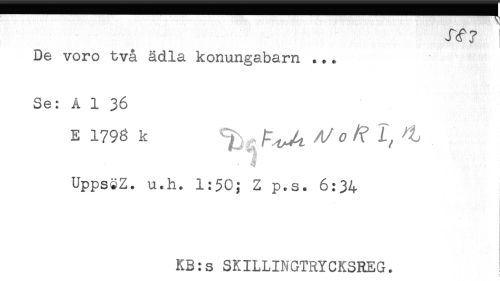 //// De voro två ädla konungabarn ... //// Se: Ål 36 //// E 1798 k ^ /r^ /l/p/? I, t //// UppscZ. u.h. 1:50; Z p.s. 6:34 //// KB:s SKILLINGTRYCKSREG. //// < ////
