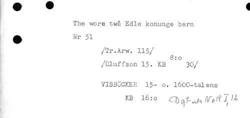 //// The wore twå Edle konunge barn //// /Tr.Årw. 115 //// /3:o //// /Oluffson 15. KB 30 //// /VISBÖCKER 15- o. 1600-talens //// KB 16:0 rb^^V, //// K ////