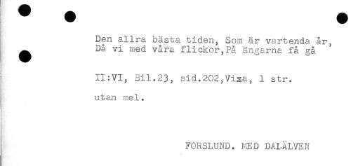 //// Den allra bästa tiden, Som är vartenda år, //// ^ Då vi med våra flickor,På ängarna få gå //// ! //// II:VI, Bil.23, sid.202,Visa, 1 str. //// utan mel * //// - //// FORSLUND. MED DALÄLVEN ////