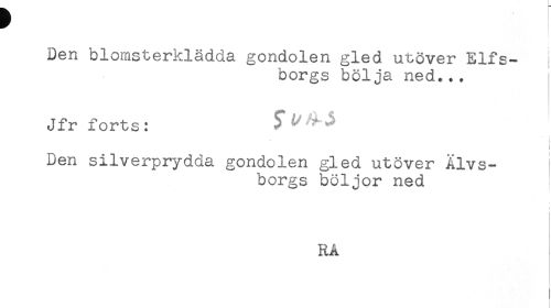//// Den blomsterklädda gondolen gled utöver Elfs- i //// borgs bölja ned... //// Jfr forts: //// Den silverprydda gondolen gled utöver Ålvs- //// borgs böljor ned //// i //// RÅ ////