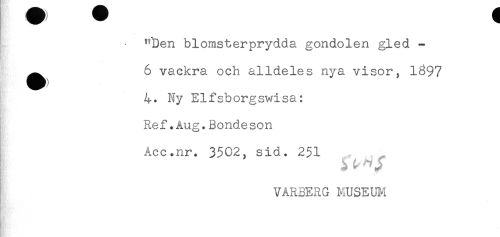 //// ''Den blomsterprydda gondolen gled - //// ^ 6 vackra och alldeles nya visor, 1897 //// Ny Elfsborgswisa: //// Ref.Aug* Bondeson //// Acc.nr. 3502, sid. 251 //// VARBERG MUSEUI4 //// IjyTti . //// - //// - ////