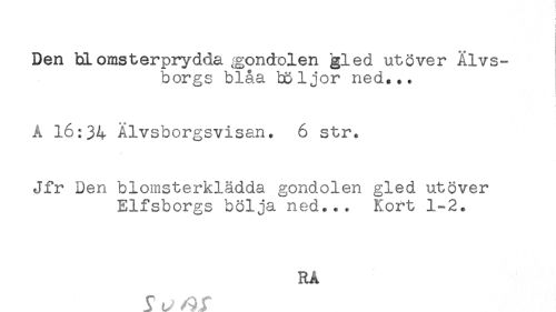 //// Den blomsterprydda gondolen gled utöver Älvs- //// borgs blåa böljor ned... //// A 16:34 Älvsborgsvisan. 6 str. //// Jfr Den blomsterklädda gondolen gled utöver //// Elfsborgs bölja ned... Kort 1-2. //// RA ////